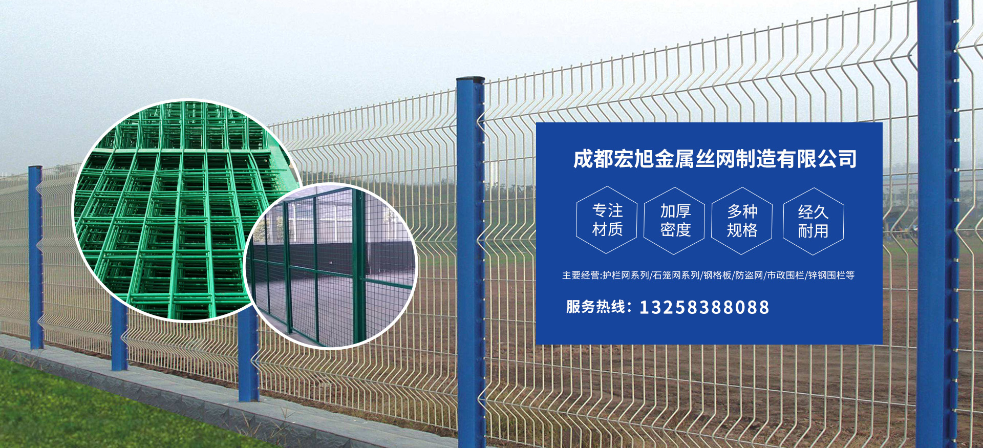 成都宏旭金屬絲網制造有限公司主營護欄網系列、石籠網系列、鋼格板、防盜網、市政圍欄、鋅鋼圍欄、鋼筋網片、聲屏障系列、波形護欄板、柔性纜索護欄、SNS邊坡防護網等其他絲網類產品。特殊規格可加工定做,也可根據客戶來圖來樣定做。自創業以來,公司一直堅持市場為導向,以客戶為根本,以實業為基礎,以技術為支持,以科研為后盾,集科研、生產、經營為一體,不斷研制開發新產品,開拓市場,走綜合發展之路。多年來,公司憑借過硬的質量,良好的信譽、優質的服務、合理的價格,贏得了市場和商家的一致好評。